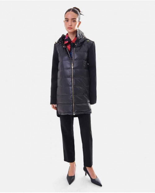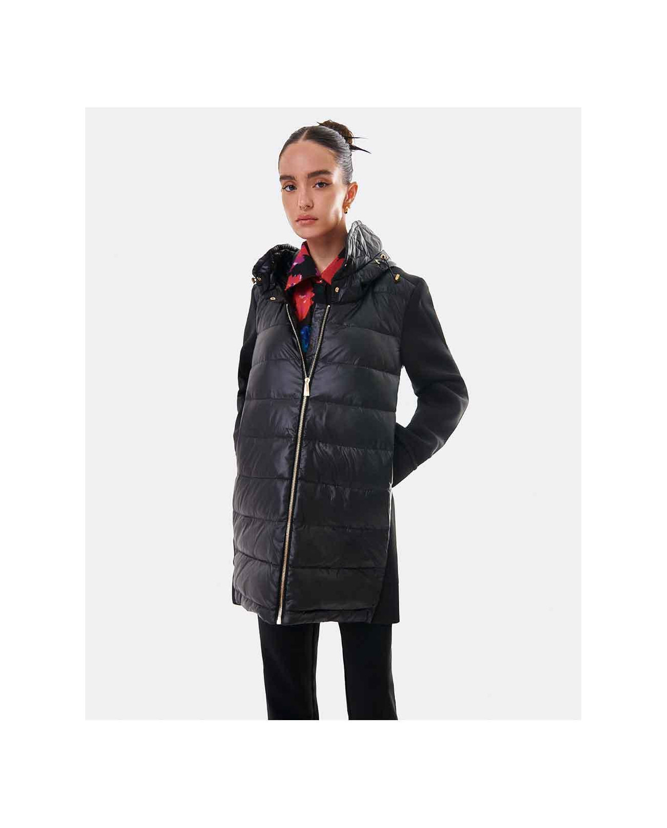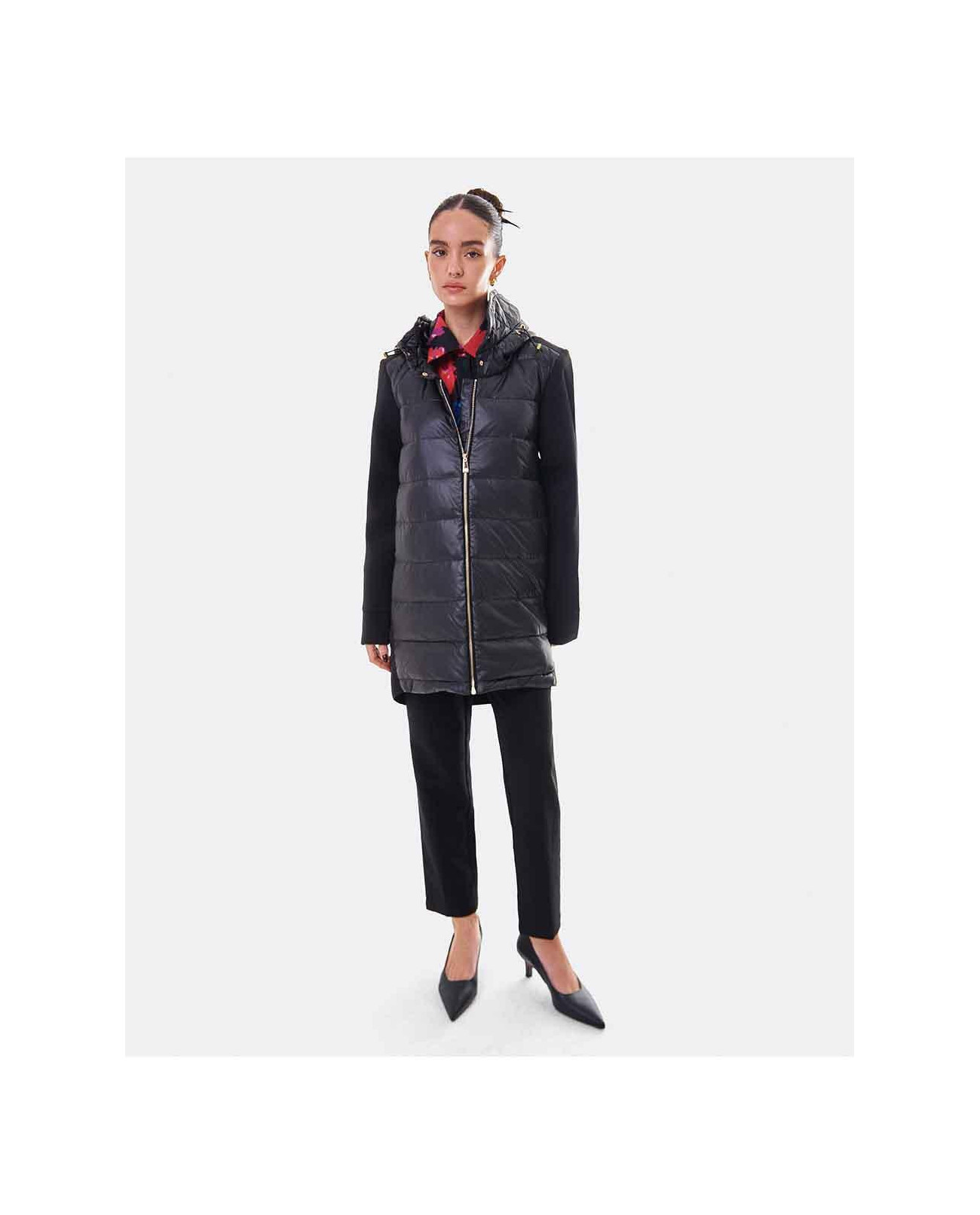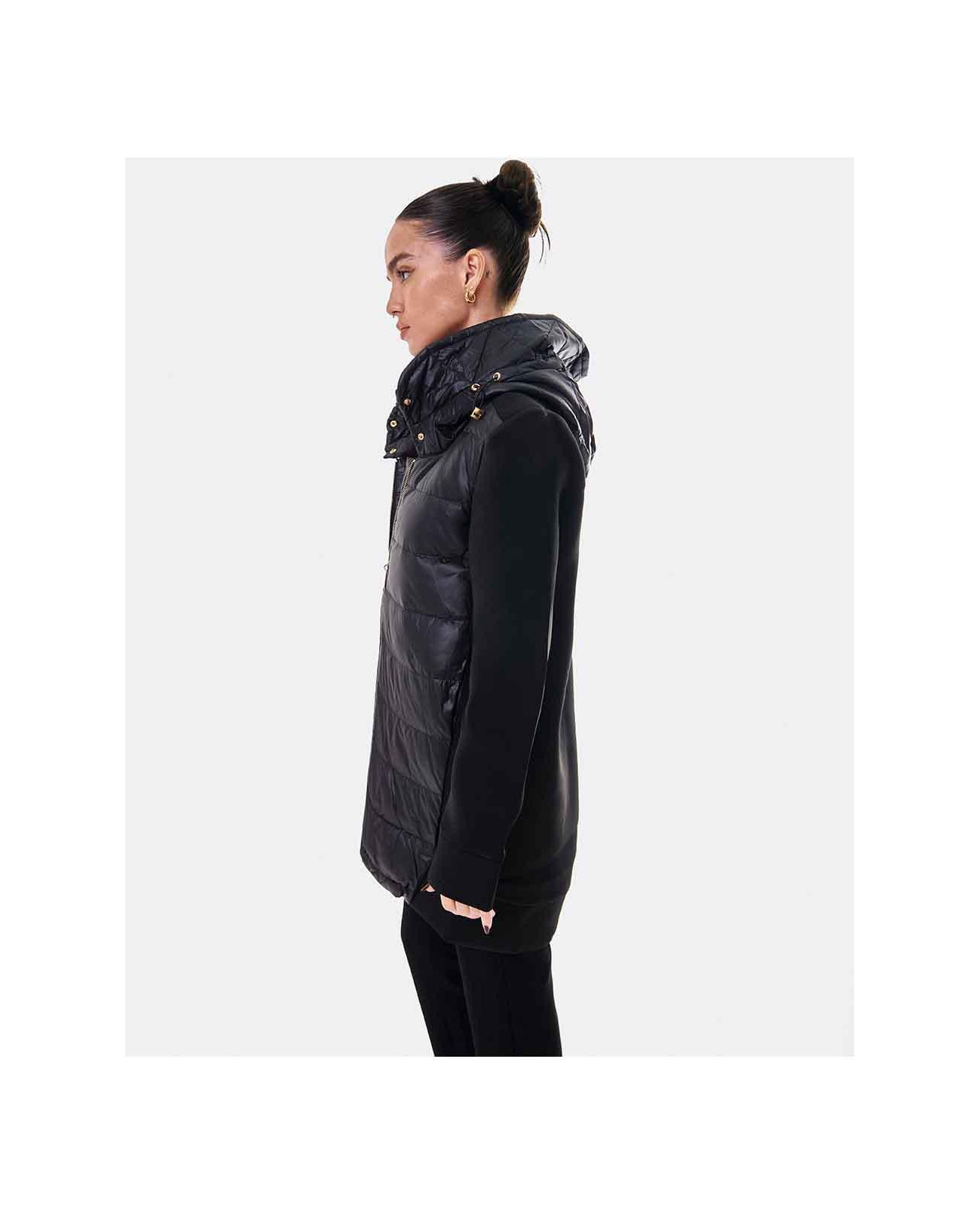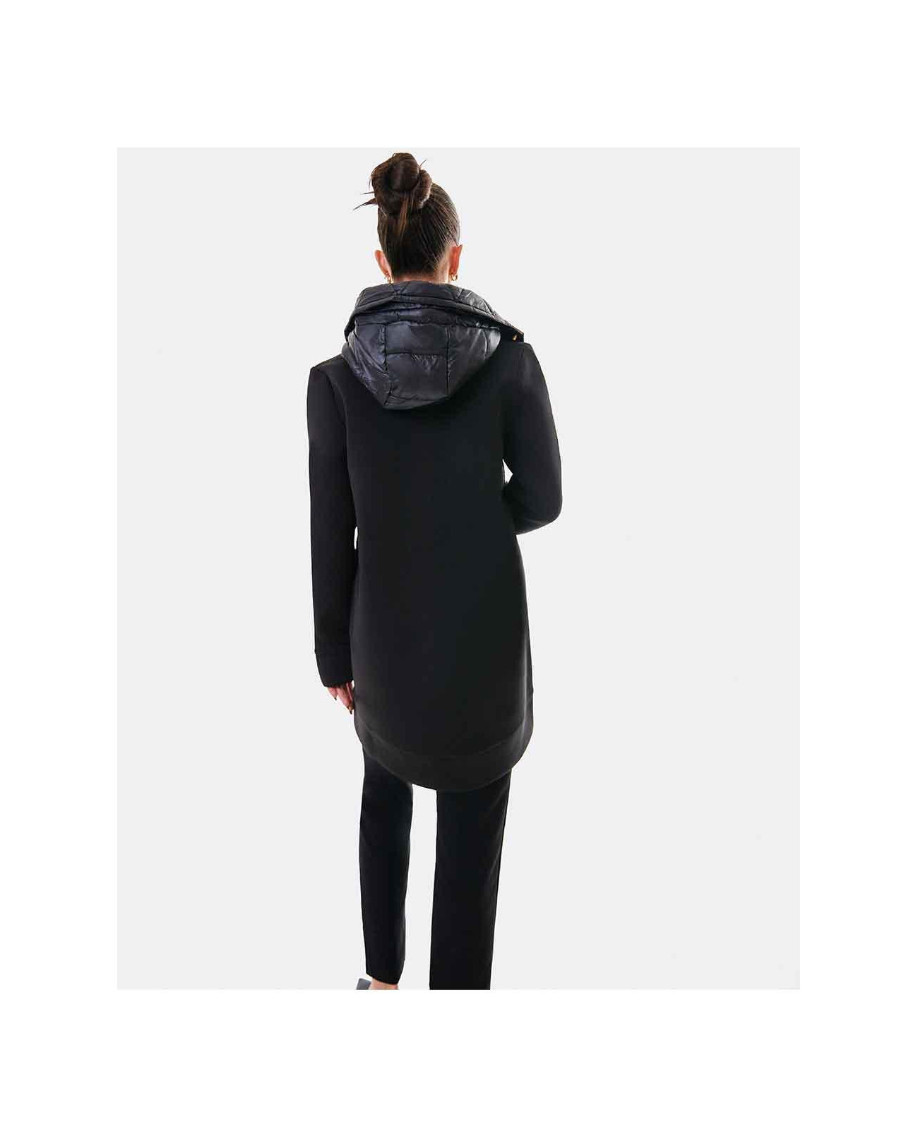 Three-quarter neoprene jacket in black, with side pockets, hood and zipper closure. It is presented as the ideal option with which to combine our wardrobe basics.