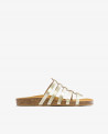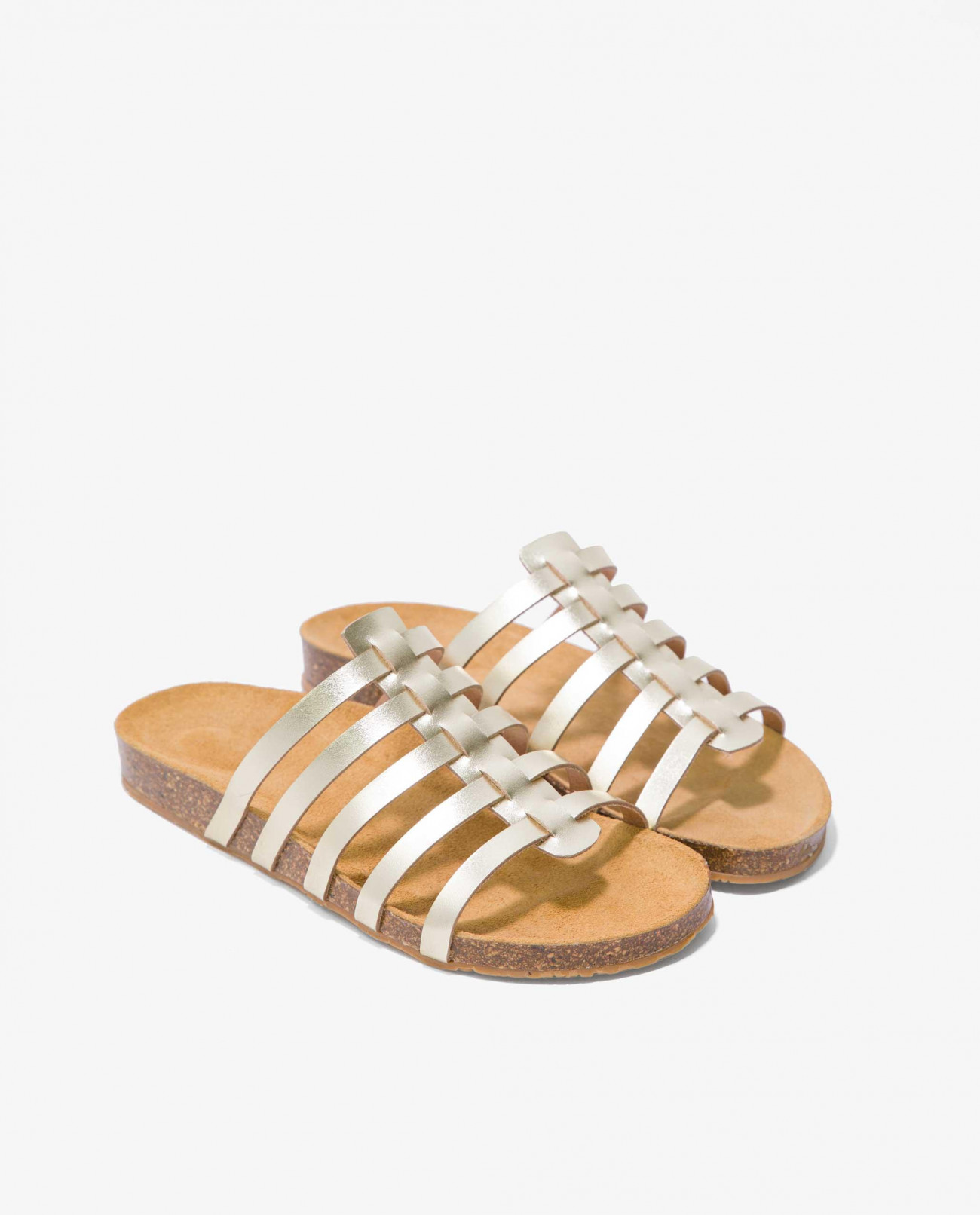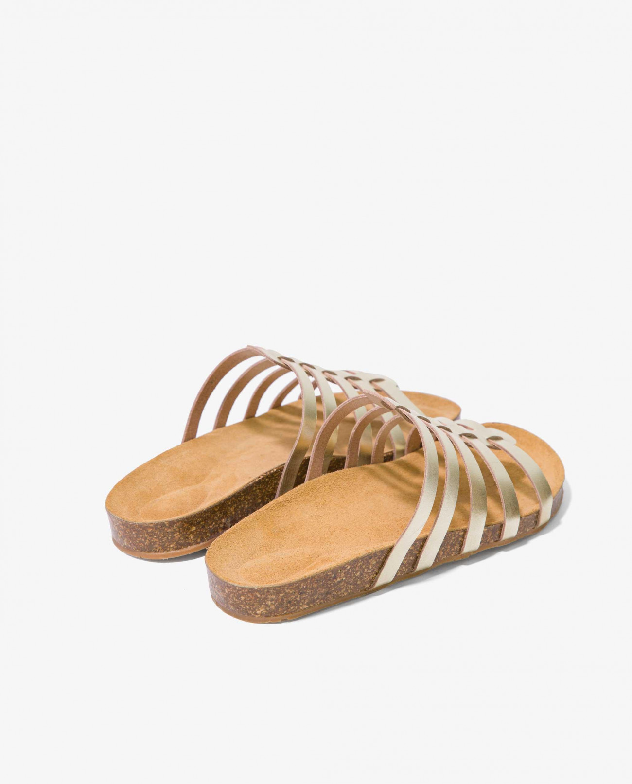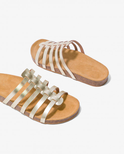 CÓMODAS SANDALIAS PLANAS DORADAS ROMANAS DESTALONADAS QUE ENMARCAN EL PIE CON LAS DIFERENTES TIRAS. PERFECTAS PARA UN PASEO POR LA PLAYA EN ESTA TEMPORADA DE PRIMAVERA-VERANO.