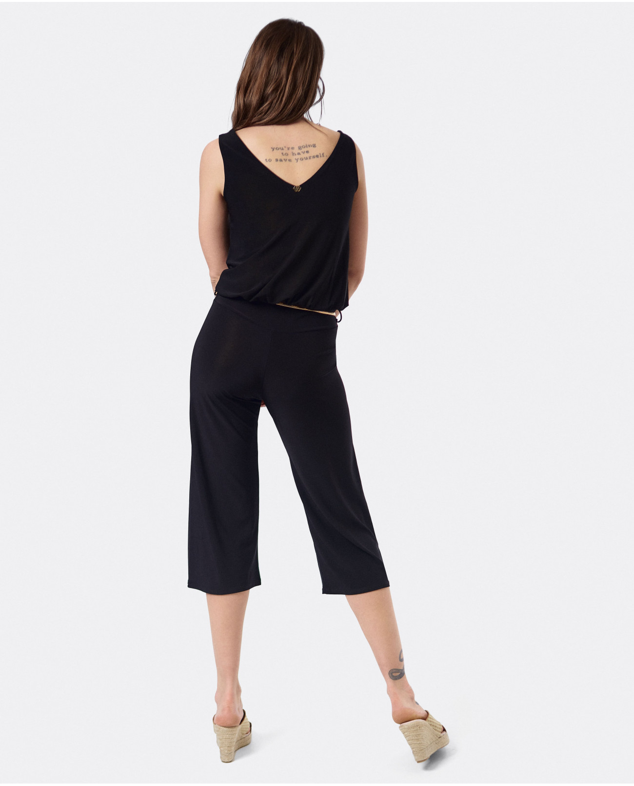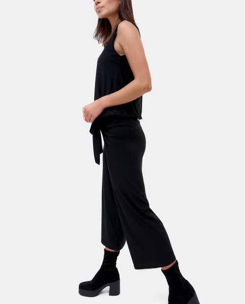 MONO MIDI DE COLOR NEGRO Y SIN MANGAS. SU DISEÑO FRUNCIDO EN LA CINTURA, CREA LA SENSACIÓN DE SER DOS PIEZAS DIFERENTES. ESTA PRENDA ES PERFECTA PARA EL DÍA A DÍA.