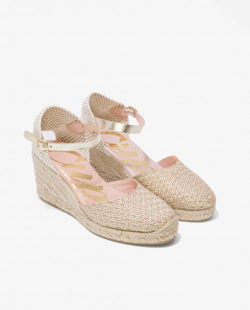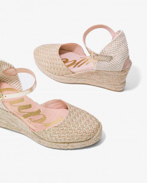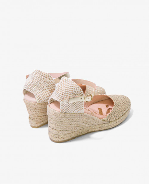 CUÑA DE YUTE EN COLOR CREMA, CON DETALLE EN LA PULSERA TOBILLERA DE COLOR DORADO, SUJECIÓN MEDIANTE HEBILLA Y PLATAFORMA ALTA. TODO UN CLÁSICO PARA ESTA TEMPORADA PRIMAVERA-VERANO.