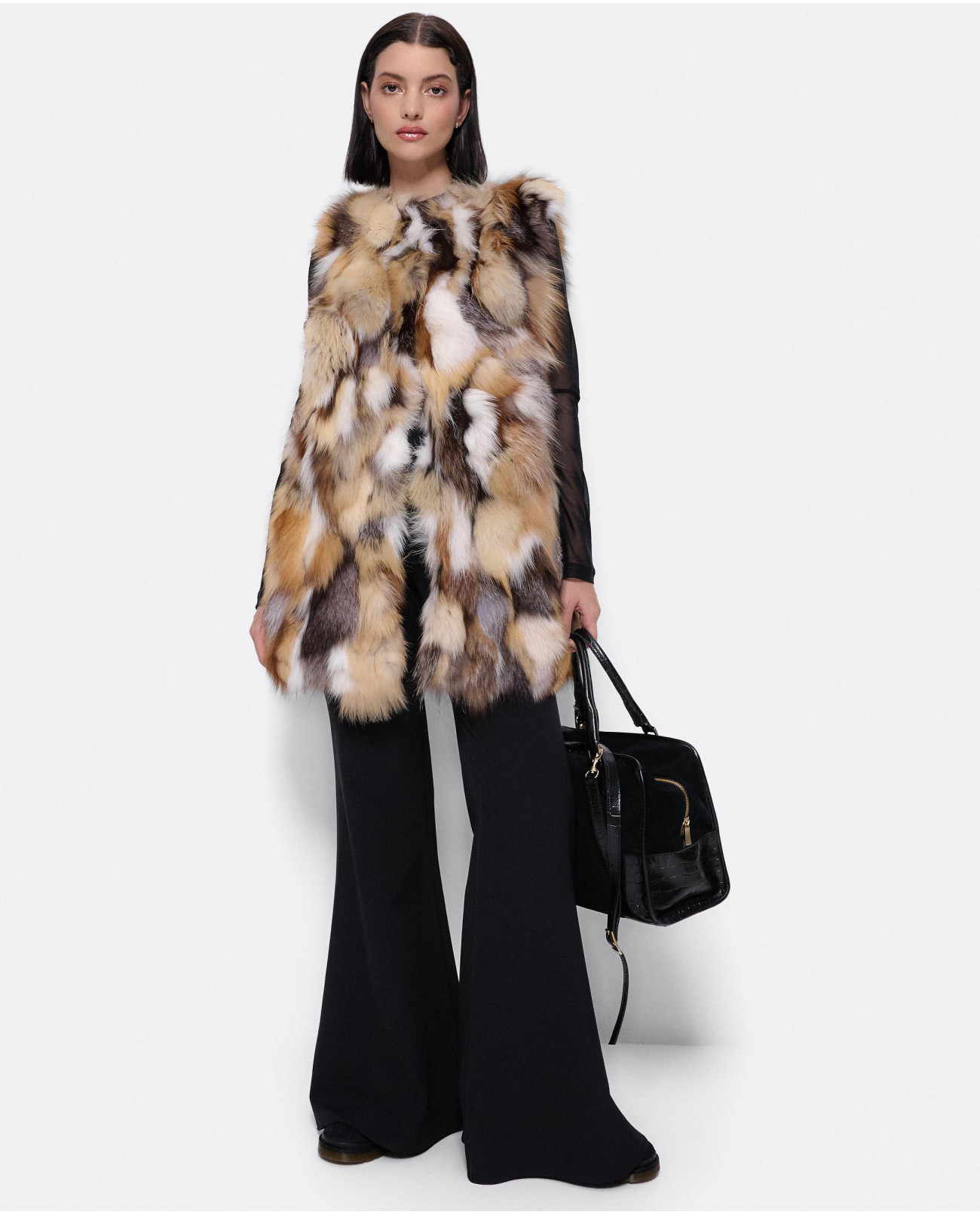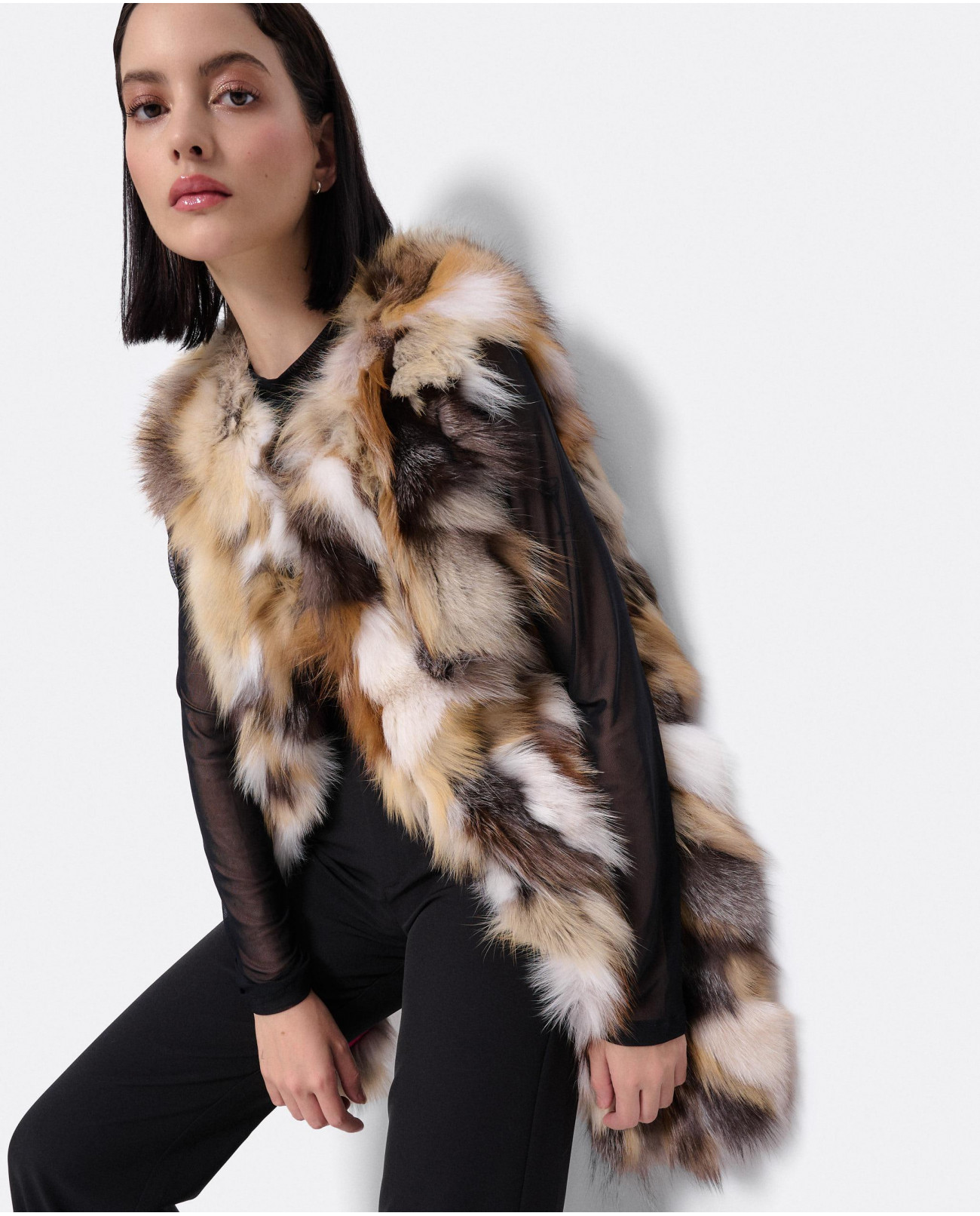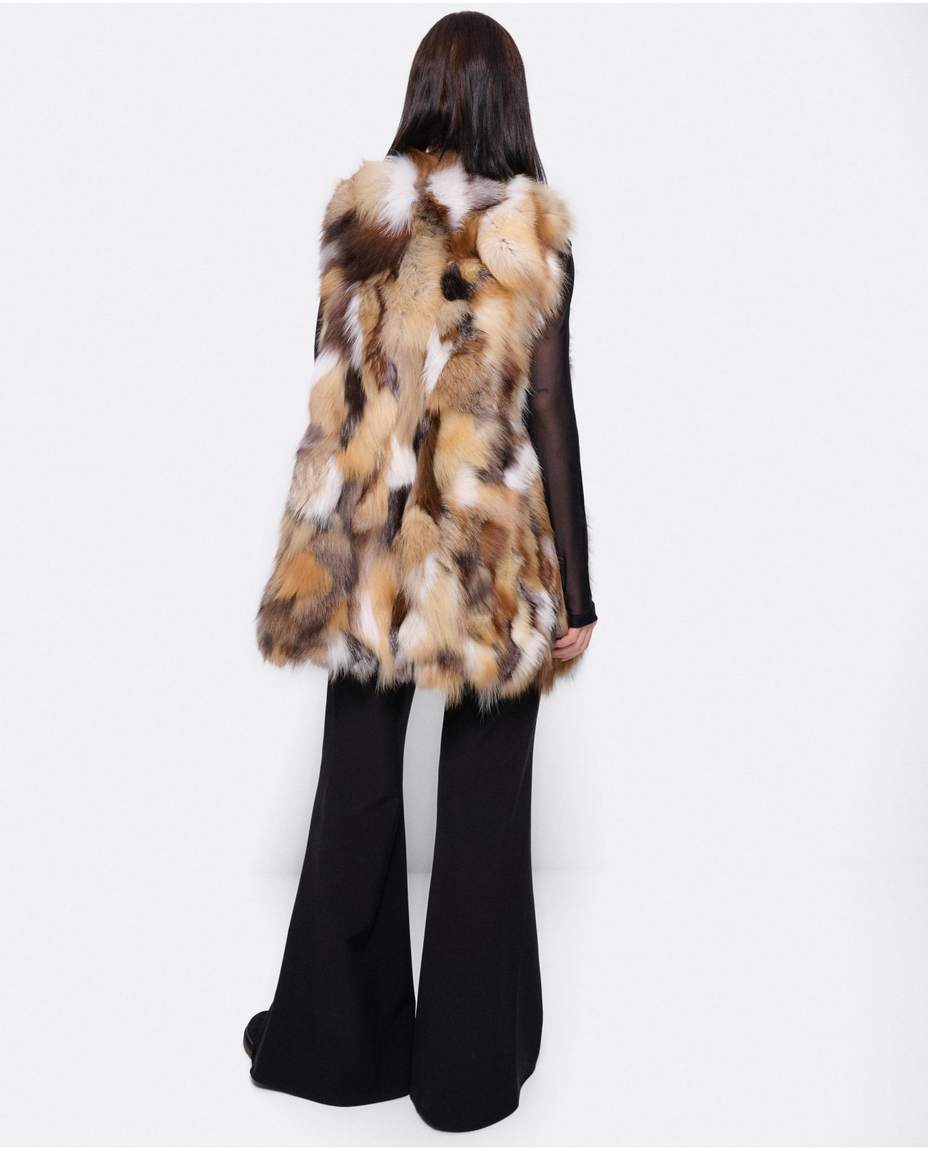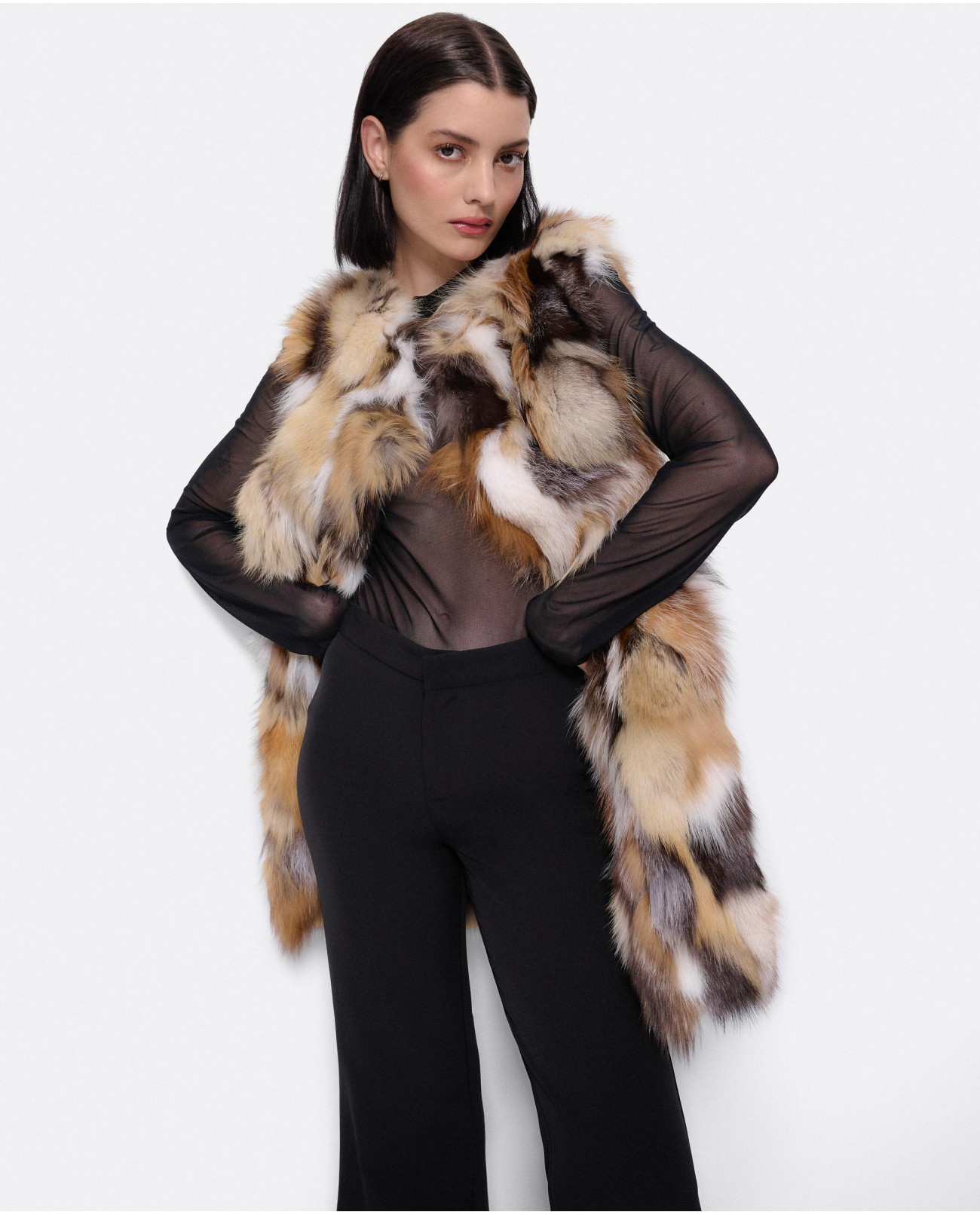 Chaleco de pelo, en tonos marrones, beige y negro. Una prenda elegante y unica. Ideal para llevar un look invernal en tendencia
